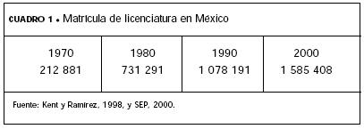 En México se estima que sólo alrededor de 20.7% de la población en edad de cursar estudios de licenciatura, entre 19 y 23 años, se encontraba en dicha situación (SEP, 2003). Dicho porcentaje se considera bajo, en contraste con países económicamente poderosos, a pesar de que en los últimos veinte años la matrícula total de nivel licenciatura se ha incrementado aceleradamente. La matrícula de 2000 duplica la de 1980 y es más de siete veces la de 1970.