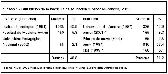 Si consideramos el proceso de expansión de las IAD en todo el país como resultado de grupos de interés nacionales que están consolidando una política educativa nacional (centralización política), es posible apreciar sus efectos en algunas localidades del estado de Michoacán. Aunque es uno de los estados con baja proporción de educación superior privada, apenas 14% (ANUIIES, 2003), la elevada concentración de la educación pública en la capital (78%) posibilita el impacto del proceso de expansión de IAD en la entidad. En Zacapu la única oferta de educación superior correspondía precisamente a la IAD analizada en este estudio, mientras que en Zamora existían cinco IAD que tenían en conjunto una matrícula equivalente a 51% de los estudiantes de educación superior, como se muestra en el cuadro 3.3