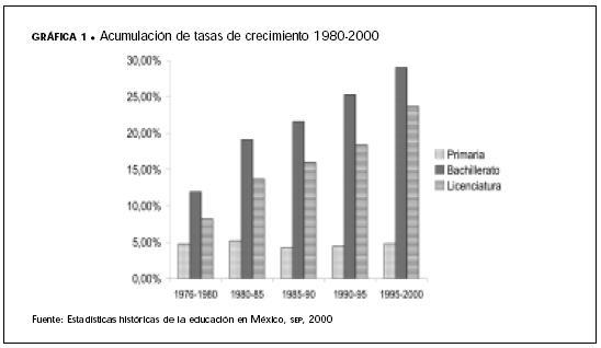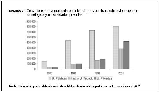 La gráfica 2 muestra un crecimiento menor de las universidades públicas en la década 19902000, mientras que la matrícula de los institutos y universidades tecnológicos crece notoriamente, y aún más la correspondiente a universidades privadas.