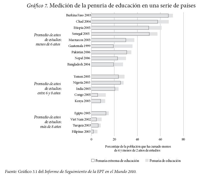 A pesar de los progresos realizados en el último decenio, la penuria absoluta de educación se sigue manteniendo a un nivel elevado. A cualquier escala global, el hecho de haber cursado menos de cuatro años de estudios constituye un signo de extrema desventaja. El conjunto de datos PEME define esa duración de estudios como indicador de referencia de la "penuria de educación" y la duración de estudios inferior a dos años como indicador de la "penuria extrema de educación" (Gráfico 7).