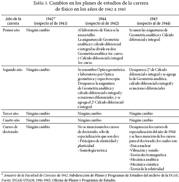 Las modificaciones que se realizaron en 1941 fueron tan sustantivas, que muy pocos fueron los cambios que sufrió este plan de estudios en las reformas realizadas en 1945 (como se muestra en la Tabla 5),30 producto de las inestabilidades que sufrió la Universidad en esos años, y que la llevaron a elaborar su proyecto de Ley Orgánica, la cual entró en vigor el 9 de enero de 1945. Con ello, el Consejo Universitario se dio a la tarea de integrar la Junta de Gobierno y elaborar el Estatuto de la Universidad. A la Junta de Gobierno fue invitado el físico mexicano Manuel Sandoval Vallarta, quien gozaba de fama internacional, se encontraba radicando en México y formaba parte del personal del Instituto de Física (Lozano y Prieto, 1988).