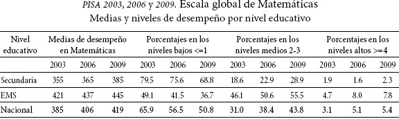 Con toda la cautela que el caso amerita, se puede hacer la siguiente reflexión: al analizar los resultados de pisa 2006 se advertía que el sistema educativo mexicano debía enfrentar dos tipos de desafío: la excesiva proporción de alumnos en los niveles inferiores, y una proporción demasiado pequeña en los niveles superiores. El primero significa que muchos jóvenes no tienen la preparación suficiente para los estudios superiores o para enfrentarse con éxito al mercado laboral; el segundo, que no estamos preparando adecuadamente a los futuros niveles directivos del país.