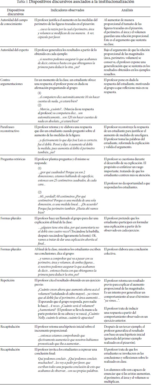En la tabla observamos que las variables (dispositivos discursivos) aparecen en diferentes momentos de la clase; esto implica que la institucionalización no se manifesta necesariamente al finalizar la clase en forma de conclusión o cierre, como lo señala Molfino (2010). De acuerdo con los registros, las variables aparecen continuamente y están asociadas a una intencionalidad didáctica del profesor de articular definiciones (descrito en los indicadores).