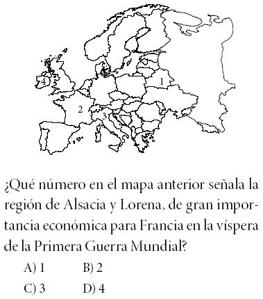 Como podemos observar, de nueva cuenta se incurre en un anacronismo al presentar un mapa con la división política actual de Europa. Ya no insistiremos en este elemento. Lo segundo que podemos decir es que los distractores apelan a un conocimiento geográfico disociado de la noción de espacio histórico: como es notorio, los tres distractores se ubican en regiones que se ubican en territorios alejados de Francia. ¿Funcionan como distractores? ¿Qué nivel de complejidad implica este reactivo? ¿Qué evalúa realmente?