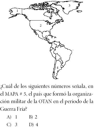 Fuera de ello la pregunta pide a los alumnos indicar el país que formó parte de la OTAN durante la "Guerra Fría". Más allá de la memorización del dato, cabe destacar que tanto el lugar marcado con el número 2, como el marcado con el número 1, son respuestas correctas, puesto que el número 1 indica la ubicación del estado de Alaska, que pertenece al país marcado con el "número": los Estados Unidos de América. Este tipo de error es grave y más frecuente de lo admisible. Tal como se explicó arriba, cabe preguntarse si realmente es posible evaluar el desempeño de los alumnos con un examen que contiene tal cantidad de errores y de tal calado.