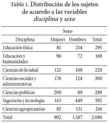 La muestra corresponde a 2 mil 089 sujetos, 902 mujeres y mil 187 hombres, todos alumnos de las licenciaturas que se ofrecen en la UACH; se utilizó un muestreo por conveniencia, tratando de abarcar la representatividad de las diferentes licenciaturas (Tabla 1). Las edades fluctúan entre los 17 y 20 años, con una media de 18.23 (DE 0.74).