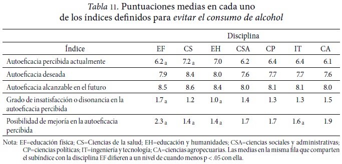 De acuerdo a los resultados obtenidos, existen diferencias significativas en todos los índices estudiados (Tabla 10). En evitar el consumo de alcohol, los alumnos de educación física se perciben con menor autoeficacia que los alumnos de ciencias de la salud; con mayor grado de insatisfacción o disonancia en la autoeficacia percibida que los alumnos de educación y humanidades; con mayor posibilidad de mejoría en su autoeficacia que los alumnos de ciencias de la salud, educación y humanidades, y los de ingeniería y tecnología. Las demás diferencias encontradas no corresponden a comparaciones relacionadas con alumnos de educación física (Tabla 11).
