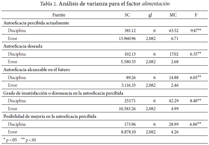 De acuerdo a los resultados obtenidos, existen diferencias significativas en todos los índices estudiados (Tabla 2). En el factor alimentación, los alumnos de educación física se perciben con mayor autoeficacia; mayor nivel de autoeficacia deseada y menor posibilidad de mejoría en su autoeficacia que los alumnos de ciencias políticas. Mayor percepción de autoeficacia alcanzable en el futuro que los alumnos de ciencias de la salud, educación y humanidades, ciencias políticas e ingeniería y tecnología. Menor grado de insatisfacción o disonancia en la autoeficacia percibida que los alumnos de ciencias de la salud y de ciencias políticas. Las demás diferencias encontradas no corresponden a comparaciones relacionadas con alumnos de educación física (Tabla 3).