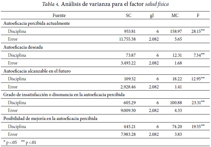 En el factor salud física (cuidarse bien físicamente y realizar ejercicio físico cuando menos 30 minutos tres sesiones a la semana), los alumnos de educación física se perciben con mayor autoeficacia que los alumnos de las demás disciplinas; y en el factor hidratación (beber más de seis vasos de agua al día y consumir dos o más piezas de fruta al día), los alumnos de educación física se perciben como más eficaces que la mayoría de los alumnos de las otras disciplinas (cuatro de las seis disciplinas), lo cual representa un resultado interesante ya que de alguna manera el optar por la carrera de educación física supone en los alumnos una intención por el cuidado físico de su cuerpo.