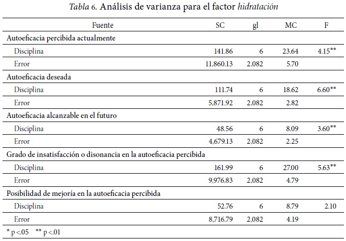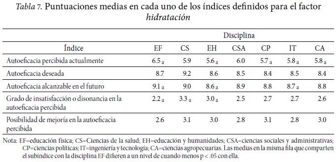 De acuerdo a los resultados obtenidos, existen diferencias significativas en todos los índices estudiados (Tabla 6). En el factor hidratación, los alumnos de educación física se perciben con mayor autoeficacia que los alumnos de educación y humanidades, ciencias políticas, ingeniería y tecnología, y ciencias agropecuarias; mayor nivel de autoeficacia alcanzable en el futuro que los alumnos de educación y humanidades, e ingeniería y tecnología; así como menor grado de insatisfacción o disonancia en la autoeficacia percibida que los alumnos de ciencias de la salud y de educación y humanidades. Las demás diferencias encontradas no corresponden a comparaciones relacionadas con alumnos de educación física (Tabla 7).