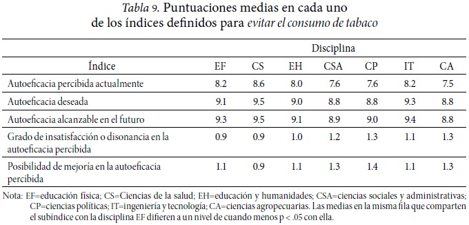 En cuanto a evitar el consumo de alcohol, los alumnos de educación física se perciben con menor autoeficacia que los alumnos de ciencias de la salud; y en evitar el consumo de tabaco, no hay diferencias con los alumnos de las demás disciplinas. Lo anterior indica que, en lo que se refiere a evitar el consumo de alcohol y tabaco, la percepción de autoeficacia es generalizada en los alumnos de las diferentes disciplinas.