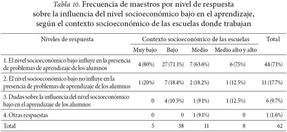 Por otro lado, el análisis realizado a las respuestas de los maestros a las preguntas: "¿cree que el nivel socioeconómico bajo de los alumnos influye en su aprendizaje?, ¿por qué?", permitió identificar cuatro niveles de respuesta (Tabla 10).