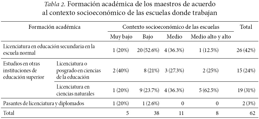 Los objetivos de este trabajo son: a) identificar las diferencias en las prácticas educativas de 62 maestros de secundaria en clases de biología que trabajan en escuelas que se sitúan en distintos contextos socioeconómicos (muy bajo, bajo, medio, medio alto y alto); y b) determinar sus creencias sobre el aprendizaje y la influencia del nivel socioeconómico bajo en este factor.