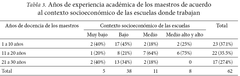 En relación al sector, 10 de los centros escolares son privados todos los centros que se sitúan en los contextos de nivel socioeconómico medio alto y alto y 2 que se sitúan en el nivel medio. El resto de los centros (29) son públicos. En cuanto a la zona geográfica, 5 centros se sitúan en poblaciones rurales 3 corresponden al nivel socioeconómico muy bajo y 2 al nivel bajo, el resto (34) se sitúan en zonas urbanas (Tabla 1). En la Tabla 2 se presenta información sobre la formación académica de los maestros, según el contexto socioeconómico de las escuelas donde trabajan; y en la Tabla 3 se consignan los años de experiencia académica de los maestros, según el contexto socioeconómico de las escuelas.