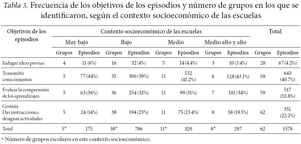 En la Tabla 5 se presentan las frecuencias de episodios según su objetivo, así como el número de grupos en los que se registraron estos episodios. Como se puede ver, los episodios de transmitir conocimientos fueron los más frecuentes en los grupos escolares de los distintos contextos socioeconómicos.