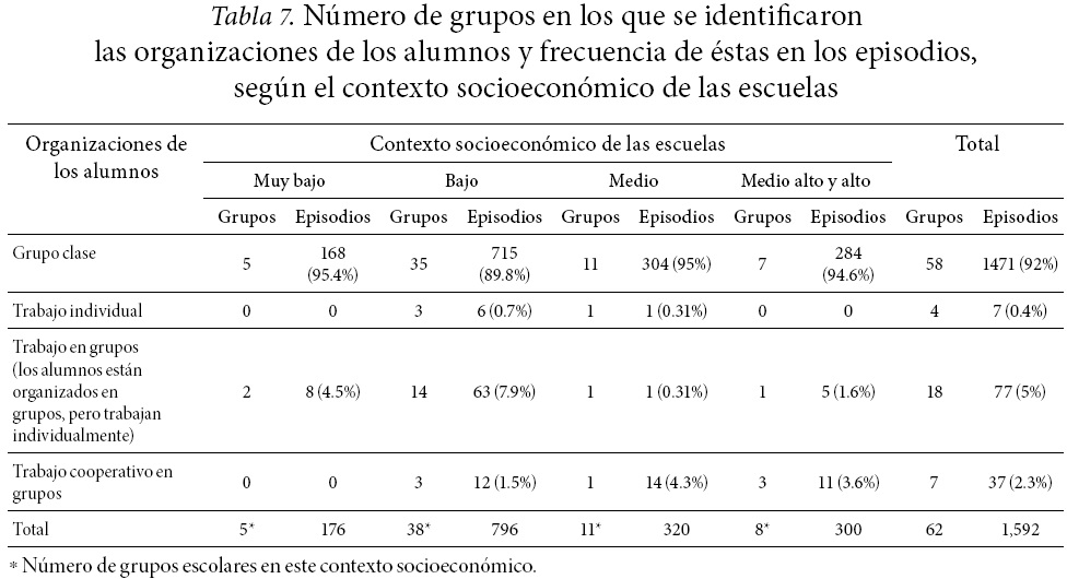 La organización de los alumnos más frecuente fue el grupo clase (el maestro se dirige al grupo de alumnos proporcionando información sobre los contenidos escolares o instrucciones sobre las tareas), independientemente del contexto socioeconómico (Tabla 7).