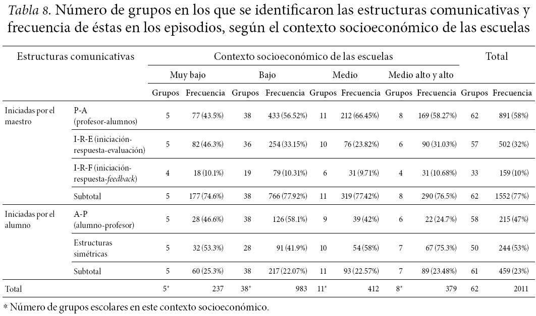 Observamos una mayor frecuencia de interacciones iniciadas por el maestro que por los alumnos en los cuatro contextos socioeconómicos. De esas comunicaciones, la más habitual fue la estructura P-A (el profesor se dirige a los alumnos proporcionándoles información de manera magistral) en los grupos de contextos socioeconómicos bajo (56.52 por ciento), medio (66.45 por ciento) y medio alto y alto (58.27 por ciento). En los grupos de contexto socioeconómico muy bajo, la comunicación más frecuente fue I-R-E (la comunicación es iniciada por el profesor a través de una pregunta, generalmente cerrada, o con una indicación sobre la tarea de aprendizaje, por ejemplo: "leer este texto"; el alumno responde o realiza la tarea y, a continuación, se produce un comentario evaluativo simple por parte del profesor, por ejemplo: "sí", "no", "bien", "mal"). La estructura comunicativa I-R-F (el maestro realiza preguntas abiertas que requieren una mayor elaboración por parte de los alumnos y existe un seguimiento o retroalimentación del profesor, quien reformula, completa y no simplemente evalúa, como en I-R-E), se registró en los grupos de los distintos contextos socioeconómicos con un porcentaje similar (alrededor de 10 por ciento) (Tabla 8).