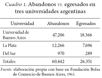 El principal problema que afectaba a la vida universitaria del país eran los altísimos índices de abandono. Sólo en la Universidad de Buenos Aires, las tasas resultaban más que alarmantes: "En la UBA tenemos 99 mil 858 alumnos inscriptos y 47 mil 206 casos de deserciones, lo que equivale a decir que por cada 10 inscriptos hay 4.7 abandonos de carrera en el periodo sin que esto signifique que los demás no vayan a abandonar posteriormente" (Fundación..., 1963: 13).