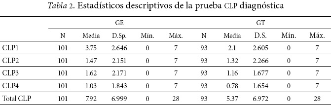 Los resultados se han organizado temporalmente, y se presentan primero los estadísticos descriptivos de cada subtest de la prueba y el puntaje total obtenido en cada grupo, y luego se presenta el análisis comparativo de los grupos utilizando como prueba estadística t de Student.