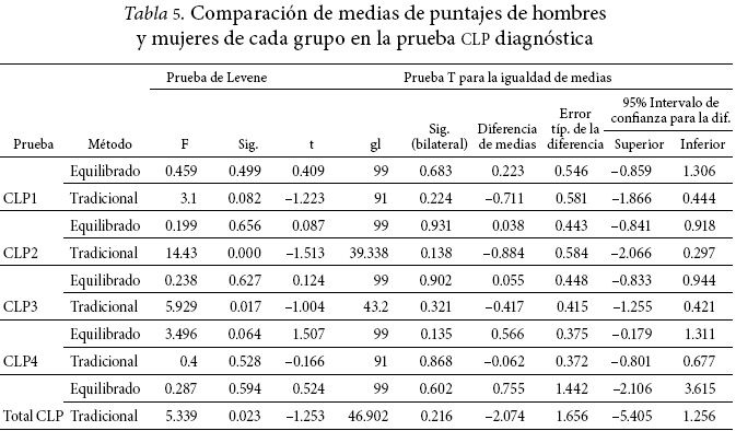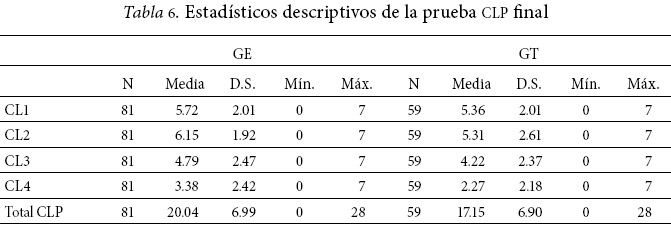 Al analizar el desempeño en la prueba CLP de hombres y mujeres al interior de cada grupo, se observa que no hay diferencias significativas en ninguno de los subtest de la prueba (Tablas 4 y 5). Hay diferencias en las respuestas de los hombres sólo en el subtest 1 a favor del GE, lo que se refleja en el puntaje final de la prueba (t(124)=2.877; p<0.005), ya mencionado anteriormente, pero no entre las mujeres, donde las medias de los puntajes son similares en ambos grupos en todos los subtest. Estos resultados son importantes porque significan que tanto los niños como las niñas tienen niveles de partida similares en la mayoría de las habilidades esperadas para el nivel y, por tanto, no sería necesario generar medidas remediales para un grupo en particular.
