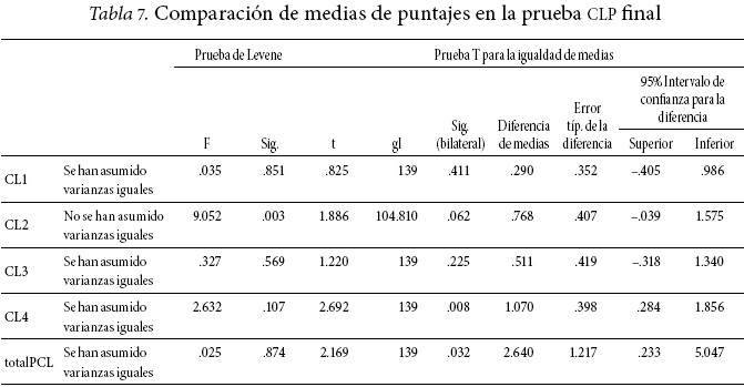 En la aplicación final realizada al inicio de segundo grado, el número de casos válidos fue de 140 estudiantes, 81 en el GE y 59 en el GT correspondiente a los niños que efectivamente estuvieron expuestos a las metodologías de enseñanza (se excluyó a quienes no tenían los datos del diagnóstico, presentaron inasistencias reiteradas o retiro del establecimiento). En ambos grupos se alcanza el rango total de puntajes de cada subtest (7 puntos; Tabla 6), siendo los subtest 1 y 2 los mejor logrados, con promedios que superan los 5 puntos en ambos grupos, lo que indicaría que los niños, al comenzar segundo grado ya tienen un alto nivel de desarrollo de las habilidades de comprensión de frases y son capaces de completarlas seleccionando palabras que le den sentido a dichas oraciones. Las varianzas de los grupos son homogéneas para todos los subtest menos el 2 (que se refiere a completar oraciones seleccionando varias palabras), donde se consideró la corrección de la prueba t. La comparación de medias indica que hay diferencia en el subtest 4 (t(139)=2.692; p<0.01) a favor del GE en 1.07 puntos, es decir, los niños que recibieron una enseñanza con el método equilibrado lograron un mejor desempeño en reconocer afirmaciones contenidas en un párrafo o texto simple luego de leerlo; esta habilidad es considerada de mayor nivel de complejidad. La diferencia citada incide en el resultado final de la prueba, donde el puntaje total del GE es superior en 2.64 puntos. En los otros subtest no hay diferencias significativas (Tabla 6). (Tabla 7)