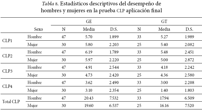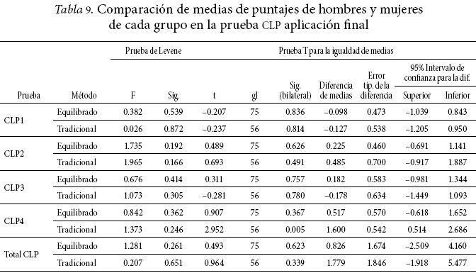 El análisis del desempeño en la prueba CLP final de hombres y mujeres al interior de cada grupo muestra que sólo hay diferencias significativas en el subtest 4 del GT (t(56)=2.952; p<0.005) donde los hombres tienen una media superior a las mujeres en 1.6 puntos (Tablas 8 y 9); esto podría indicar que los niños que reciben una enseñanza con el método tradicional logran mayor desarrollo que las niñas en el reconocimiento de afirmaciones contenidas en un párrafo o texto simple luego de leerlo. En los otros subtest no hay diferencias de sexo al interior de cada grupo, lo que indicaría que ninguno de los dos métodos de enseñanza tiene un sesgo de género implícito.