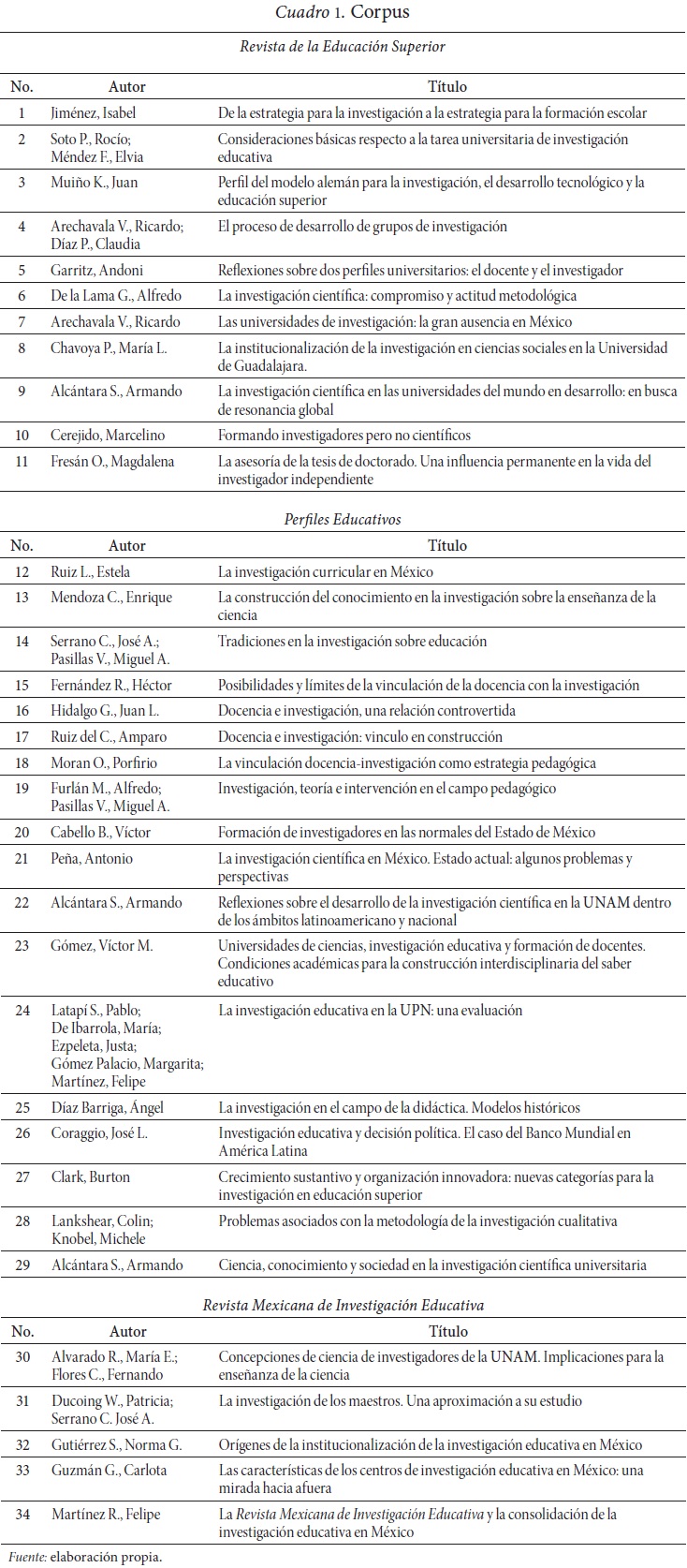 El análisis sobre las asignaciones de sentidos de la investigación educativa se desarrolló a partir de la interrelación de los siguientes elementos: 1) las preguntas de investigación que orientan y expresan el interés del investigador; 2) los referentes teóricos que sirven como herramientas para la construcción de las categorías de investigación; y 3) los referentes empíricos que se articulan con estas categorías (Buenfil, 2008). El corpus se integró con 34 artículos que proceden de tres revistas académicas mexicanas especializadas (Cuadro 1).6