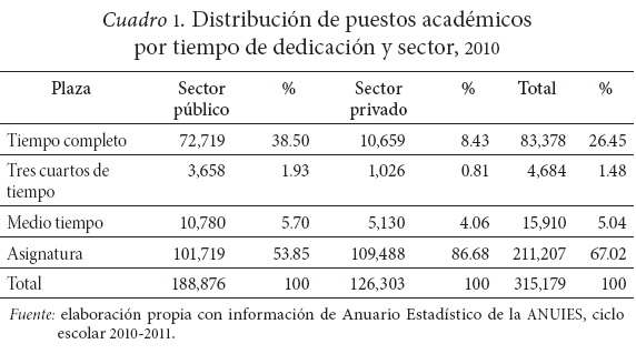 Pero ¿cómo se distribuyen actualmente los académicos mexicanos, qué actividades realizan, cuáles son sus contratos? De acuerdo a la información disponible, los profesores de la educación superior se reparten entre poco más de 3 mil instituciones; ocupan puestos de tiempo parcial (67 por ciento), aunque una tercera parte de ellos mantiene plazas de tiempo completo, medio tiempo o tres cuartos de tiempo (Tuirán, 2012); y realizan preferentemente actividades de docencia. El tipo de financiamiento de los establecimientos marca una diferencia notable en la distribución de los académicos, ya que en el sector privado predominan las plazas de tiempo parcial (86 por ciento) mientras que en el público la configuración de los puestos es menos desigual (Cuadro 1).