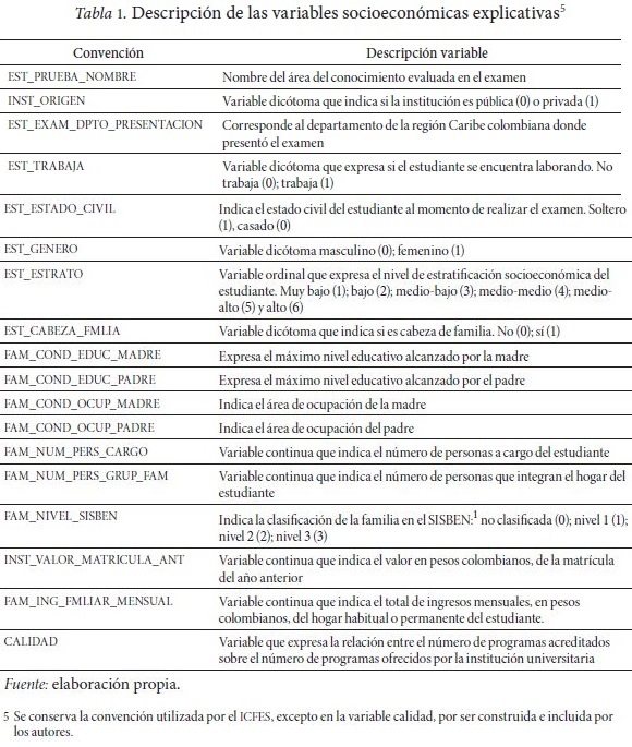 En el estudio se emplearon los datos del Instituto Colombiano para la Evaluación de la Educación (ICFES)4 relacionados con el puntaje obtenido por 22 mil 525 estudiantes de 41 universidades de los departamentos de la región Caribe (Atlántico, Bolívar, César, Magdalena, Córdoba, La Guajira y Sucre) en la prueba Saber Pro aplicada en el año 2009. Para explicar el desempeño académico universitario se exploró el efecto de diferentes variables que representan las características personales, familiares y socioeconómicas de quienes presentaron la prueba Saber Pro de 2009 (Tabla 1).