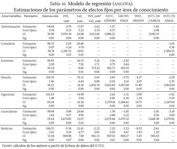 Cuando se incluye una interacción entre variables de distinto nivel, el INS del estudiante y la variable calidad (CAL_CENT) de la universidad, el coeficiente toma un valor positivo y es significativo en los programas de Administración, Economía y Derecho, lo cual indica, para estos programas, que la relación entre el rendimiento académico y el nivel socioeconómico de los estudiantes es mayor cuanto mayor es la calidad de la institución. En los casos como Derecho y Economía, donde el INS no explica el rendimiento académico por sí solo, la interacción entre esta variable y la calidad de la institución resulta significativa y positivamente relacionada con el rendimiento académico. Cabe anotar que no se obtiene significancia estadística para la variable INS, y tampoco para su interacción con la variable CAL_CENT en el área de Ingenierías; en otras palabras, no se puede afirmar que el nivel socioeconómico esté asociado al rendimiento académico en esta área. Además, en el área de Medicina, a pesar de que la interacción entre la calidad de la institución y el INS es significativa, el signo del coeficiente es negativo, contrario al efecto esperado de una relación directa entre las dos variables y el rendimiento académico.