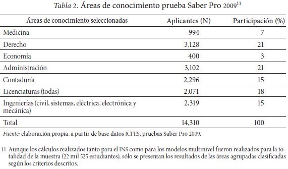 Inicialmente se presenta el modelo nulo por área, y a partir de éste, la estimación del "efecto universidad" (modelo 1). Seguidamente se explican las medias de rendimiento de las distintas universidades, o variabilidad de nivel 2, debida a la calidad de la institución (modelo 2).13 Finalmente se analizan las diferencias por área de conocimiento, tanto en las medias de rendimiento académico entre las universidades o nivel 2, como las diferencias entre el rendimiento académico de los estudiantes de la misma universidad (modelo 3). En síntesis, para facilitar la interpretación de los resultados se construye un modelo de dos niveles (estudiantes y universidad) tanto de efectos fijos como aleatorios (modelo mixto), partiendo de la estructura más sencilla, que es el modelo vacío o nulo, hasta llegar a un modelo multinivel con un factor de efectos aleatorios. Los resultados son presentados por área de conocimiento y se toma como variable dependiente el puntaje obtenido en la prueba Saber Pro 2009. 14