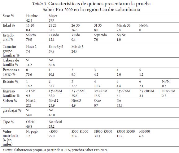 La muestra de personas que realizaron la prueba Saber Pro 2009 se concentra en los estratos bajos (55 por ciento pertenece a los estratos 1 y 2), los estratos 5 y 6 sólo aportaron 6.5 por ciento de la muestra. A su vez, los ingresos familiares se ubican principalmente en el rango de menos de tres salarios mínimos (70 por ciento). El 54 por ciento de la muestra estaba trabajando al momento de diligenciar el formulario.