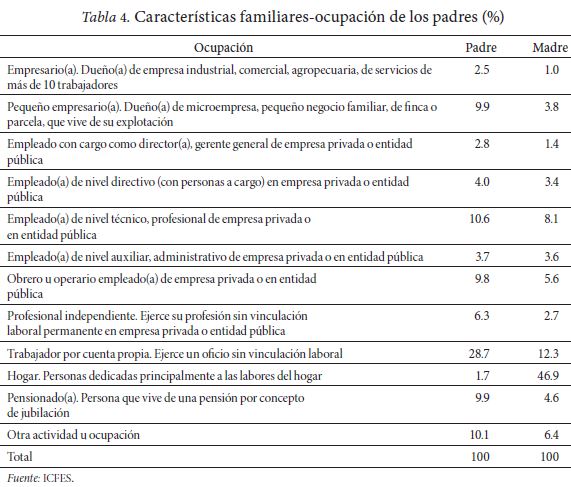 El análisis descriptivo de los individuos estudiados revela que cerca de 60 por ciento de la muestra es de sexo femenino, la edad predominante se ubica entre los 21 y 25 años (57 por ciento) y la mayoría (79 por ciento) tienen la condición de solteros. El tamaño de la familia promedio oscila en el rango de entre 3 y 5 integrantes (68 por ciento), 15 por ciento es cabeza de familia y cerca de 26 por ciento tiene por lo menos una persona a cargo. El nivel educativo es similar entre padre y madre, con un porcentaje de profesionales ligeramente mayor en el caso de los padres. Por ocupación,12 cerca de la mitad de las madres de los que presentaron la prueba se dedican a labores del hogar (47 por ciento) y 12 por ciento de los padres son empresarios.