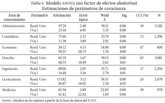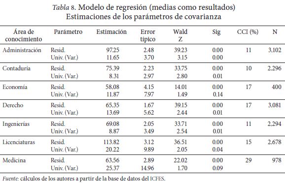 El coeficiente de correlación intraclase (CCI), el cual representa el grado de variabilidad existente entre las distintas universidades en comparación con la variabilidad presente entre los estudiantes de la misma universidad, se presenta en la penúltima columna. Esta medida, para el caso del área de Derecho, Medicina y Economía, es bastante alta, e indica que de la variabilidad total del rendimiento académico en estas áreas, el 43, 39 y 47 por ciento respectivamente, corresponde a la diferencia entre las medias de las universidades; el valor restante (57, 61 y 53 por ciento respectivamente), por lo tanto, se atribuye a la variabilidad del rendimiento académico dentro de cada universidad.