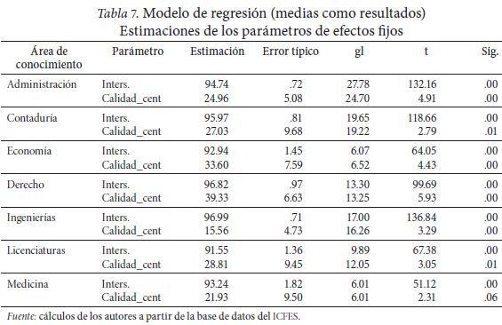 Los resultados de la Tabla 7 muestran las estimaciones de los dos parámetros de efectos fijos para cada área de conocimiento, es decir, la intersección y el coeficiente asociado a la covariable CALIDAD_CENT de la universidad.