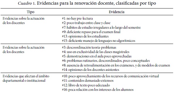 En el Cuadro 1 se recogen las evidencias reseñadas en el apartado anterior agrupadas en tres categorías o tipos: evidencias sobre los discentes, evidencias sobre los docentes y evidencias que afectan el ámbito departamental o institucional. También hemos encontrado un par de evidencias adicionales importantes que se refieren a las preconcepciones de los docentes (sobre estudiantes buenos y malos) y a la institución (coordinación entre pregrados), que entrarían en la tercera de las categorías anteriores.