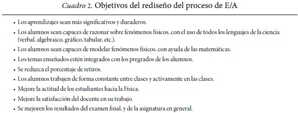 En la aplicación de la estrategia REUBE para la mejora de la enseñanza de la Física de esta Universidad se inició un proceso de acompañamiento pedagógico, seguimiento y pruebas múltiples en busca de evidencias de deficiencias en el proceso de E/A en dos de los ocho grupos de Física 2, una materia de tercer semestre de las carreras de Ciencias e Ingeniería. El acompañamiento estuvo a cargo de un equipo de investigadores de la Universidad de los Andes. Todos los estudiantes de estas titulaciones cursan esta materia en grupos mezclados, que no diferencian en el pregrado entre la posterior orientación del alumno hacia una determinada ciencia o ingeniería. Típicamente, en uno o dos semestres anteriores se cursa Física 1 en las mismas condiciones. Uno de los investigadores acompañó en todas las clases del semestre a los dos docentes, en sus clases respectivas. Los objetivos generales del acompañamiento pedagógico, con relación al proceso de E/A implementado en ese momento por el docente respectivo, fueron los siguientes: