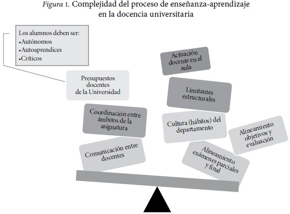 Para el logro de estos objetivos se analizaron todos los aspectos de la práctica docente. En la Fig. 1 se esquematiza la complejidad de la tarea docente en la Universidad, que incluye elementos de la misión de la Universidad, temas inter e intradepartamentales, limitantes estructurales (a los que nos referiremos en otro lugar), cuestiones de comunicación y, por supuesto, todos los elementos del proceso de E/A (evaluación, alineamiento entre objetivos, metodologías y evaluación, etc.).