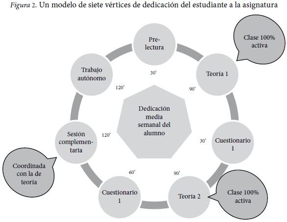 En la Fig. 2 se recoge el modelo global de innovación propuesto, centrado en el trabajo del estudiante. El modelo se basa en una distribución temporal de tareas semanales que deben de desarrollar tanto los docentes como los discentes, así como la metodología con la que se abordará cada una de estas actividades. Como puede verse, la semana se inicia con prelectura breve previa a la clase (30 minutos, vértice superior de la Fig. 3), que prepara al alumno para la primera clase de teoría (T1). Esta clase, al igual que la segunda (T2), será eminentemente activa, es decir, se aleja del carácter de clase magistral que tenía la docencia de la Física antes del ejercicio de acompañamiento pedagógico descrito en este trabajo. En las clases teóricas se contempla el uso de sistemas de seguimiento y de retroalimentación instantánea, como las "tarjetas de respuesta". A continuación de la Ti se mandará a los estudiantes un cuestionario breve en línea, para incidir en la materia trabajada en la clase teórica; lo mismo ocurre tras la T2, pero esta vez el cuestionario contiene ejercicios de mayor complejidad y duración. Cierra la semana la sesión complementaria, con contenidos bien coordinados con los trabajados en las dos clases teóricas. Hay un margen adicional de dos horas para el trabajo autónomo de los estudiantes.