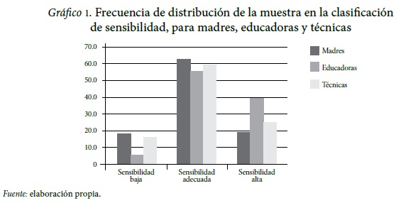 De las madres evaluadas, 18.3 por ciento presenta una sensibilidad baja, mientras que 81.7 por ciento una sensibilidad adecuada o alta. El personal educativo, por su parte, presenta en un 13.9 por ciento una sensibilidad baja, y en un 86.1 por ciento una sensibilidad adecuada y alta (Tabla 1). El Gráfico 1 muestra la distribución de la clasificación de la sensibilidad de las madres, las educadoras y las técnicas. Se puede apreciar en todos los grupos una distribución simétrica, con un predominio de sensibilidad adecuada.