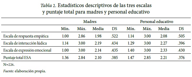 En cuanto a los puntajes en sensibilidad, las madres obtienen una media de 2.10 (DS=.385), mientras que el personal educativo obtiene una media de 2.21 (DS=.376). Los descriptivos para las escalas del instrumento se encuentran en la Tabla 2, y las medias para madres, educadoras y técnicas pueden apreciarse en el Gráfico 2.