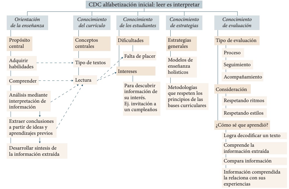 La enseñanza de un contenido específico, como por ejemplo la alfabetización inicial, demanda de un conocimiento docente imbricado con el contexto, las interacciones entre el estudiantado, el profesorado y las prácticas de lectura y escritura (Castedo, 2007). Desde esa perspectiva podemos afirmar que las y los docentes poseen un conocimiento especializado y experiencial (Azam, 2020), el CDC, que influye significativamente en la calidad de la enseñanza y en las actuaciones que en ella se desarrollan (Barendsen y Henze, 2019). Para Castedo (2007), el CDC ayuda al profesorado a diseñar situaciones didácticas que consideren la comunicación de los saberes escolares, implementar intervenciones didácticas para enfrentar los errores de los niños y niñas o planear la distribución, organización y análisis de cada situación de lectura y escritura, así como reflexionar respecto del avance de los estudiantes sobre el aprendizaje de la lectura y la escritura. La idea germinal de Shulman (1987) sobre el conocimiento pedagógico del contenido enfatiza la metodología de enseñanza y el valor que ésta tiene como marco de referencia de lo que todo profesor y profesora sabe (o debe saber) para ayudar a sus estudiantes a entender los tópicos de una asignatura en particular, así como para identificar sus dificultades de aprendizaje usando múltiples estrategias de instrucción, representación y evaluación mientras trabaja dentro de las limitaciones contextuales, culturales y sociales propias del ambiente de aprendizaje (Park y Oliver, 2008). Por esa razón nos interesamos en el CDC en el contexto de la didáctica del lenguaje, por hacer del contenido y su enseñanza su objeto de reflexión.
