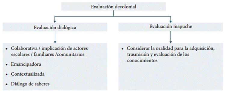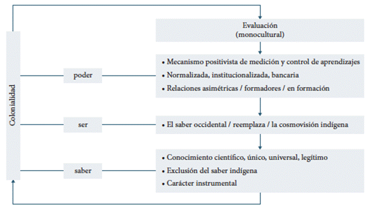 La evaluación escolar desde la colonialidad del poder consiste en “una específica racionalidad o perspectiva de conocimiento que se hace mundialmente hegemónica, colonizando y sobreponiéndose a todas las demás, previas o diferentes” (Quijano, 2014: 799). De ese modo, el discurso monocultural de la evaluación escolar eurocéntrica pasó a convertirse en un mecanismo de control social que opera a través de la imposición de normas estatales e institucionales para legitimar el saber asociado al poder colonial y se atribuye la facultad de descalificar aquellos saberes distintos a los occidentales. Así, el modelo de evaluación monocultural basado en exámenes escritos individuales, con las calificaciones como prioridad, ignora los saberes culturales del estudiantado indígena (Mellado y Chaucono, 2015).