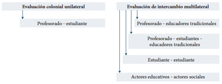 La evaluación dialógica (Fig. 3) es un componente educativo clave para superar la monoculturalidad de la enseñanza y neutralizar el colonialismo del ser, el pensar y el saber instaurado por el sistema escolar occidental en el contexto indígena. Esta evaluación debe constituirse en un proceso pedagógico de valoración e interacción social entre los actores del proceso educativo (profesores, estudiantes, educadores tradicionales, familiares y líderes comunitarios indígenas) a través de la racionalidad comunicativa oral. Dicha racionalidad de diálogo de saberes es característica de los principios de la pedagogía y la educación indígena como método de trasmisión de los saberes, conocimientos y finalidades educativas propias.