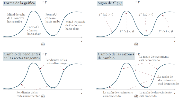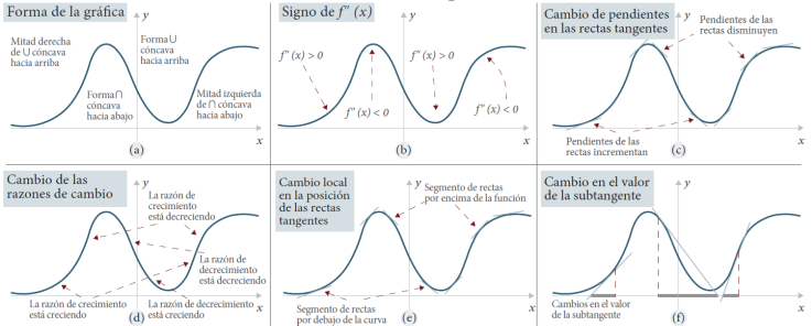 Jones (2019) nos presenta cuatro formas de interpretar la concavidad relacionadas con el concepto de punto de inflexión. Como se observa en la Fig. 4, la concavidad se relaciona con: a) la forma de la gráfica; b) el signo de la segunda derivada; c) el cambio de pendientes de las rectas tangentes; y d) el cambio en las razones de cambio.