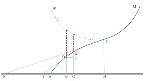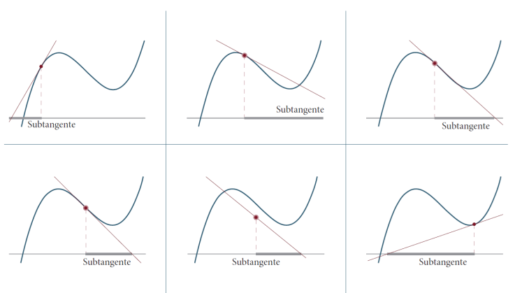 En la obra de Agnesi, específicamente en el libro II, capítulo IV, Castañeda (2002) reconoce dos caracterizaciones del punto de inflexión: desde una propiedad infinitesimal; o referente a la subtangente. La subtangente es el segmento formado por la proyección sobre el eje horizontal (en este caso) creada por el segmento de la tangente en un punto de una curva y que está comprendido entre el punto de tangencia a la curva y el punto donde la tangente corta al eje considerado. En la Fig. 2 se puede observar el cambio de la subtangente en diferentes puntos de la curva.