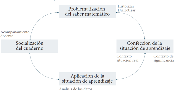 Metodológicamente, este estudio se divide en cuatro fases: problematización del saber matemático; creación de la situación de aprendizaje; aplicación de la situación de aprendizaje; y socialización del cuaderno (que incluye la situación, reflexiones de la aplicación y profundizaciones sobre el saber matemático) con los profesores (Fig. 5). Cada fase se vivió en equipo, de manera cooperativa y dinámica, y se describe en los siguientes apartados de esta sección.