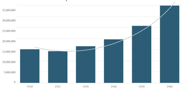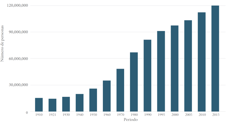 En esta gráfica se observa una disminución del año 1910 a 1921 como resultado de la fuerte incidencia de enfermedades infecciosas, la presencia de enfermedades trópico endémicas, paludismo, numerosos brotes epidémicos de viruela, tifo, peste, cólera, fiebre amarilla y gripe española; todo en un contexto de crisis económica, inestabilidad política, migración y guerras devastadoras (Zavala, 1992). Con respecto al cambio del crecimiento que se observa cerca de la década de los setenta, el Consejo Nacional de Población estableció una política con objetivos y metas para obtener un crecimiento más lento de la población (Ordorica, 2008) con apoyo de la comunicación educativa en pro de la planificación familiar.