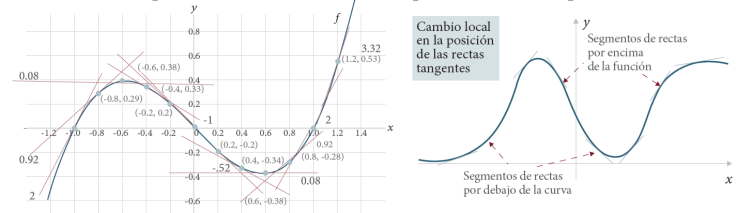 Este argumento es válido para vecindarios de los puntos de tangencia. A esta estrategia la hemos llamado cambio local en la posición de las rectas tangentes, comprendido como segmentos de las rectas tangentes que están por debajo o por arriba de la función.