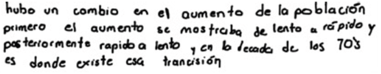 La situación de aprendizaje provocó que las estudiantes realizaran una breve indagación sobre los hechos históricos de México que afectaron al crecimiento de la población; parte de su explicación para referirse a la población mínima que refieren los datos tiene que ver con la revolución mexicana. Además, notaron el cambio de crecimiento en la década de los setenta, pero no lo asociaron con algún hecho histórico que explicara ese comportamiento, quizá por estar relacionado con medidas de carácter social; sin embargo, el docente sí comentó el motivo de este cambio.